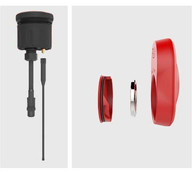 Система WiMEA MOB+ Basepack включает: серое судовое устройство WiMEA xHUB и красное беспроводное MOB-устройство WiMEA xFOB, включая батарею-таблетку CR2032.