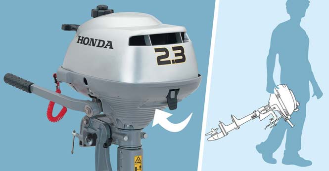 Honda BF 2.3 имеет встроенный бак (1,1 л), ручку для переноски и управление одной рукой с помощью ручного дросселя с центробежным сцеплением. Объем: 57 см³, мощность: 2,3 л.с. (1,7 кВт). Переключатель: V-N 360°. Вес приблизительно 13,5 кг. Доступен в версиях с коротким или длинным валом. Идеальный двигатель для небольших тендеров и лодок.