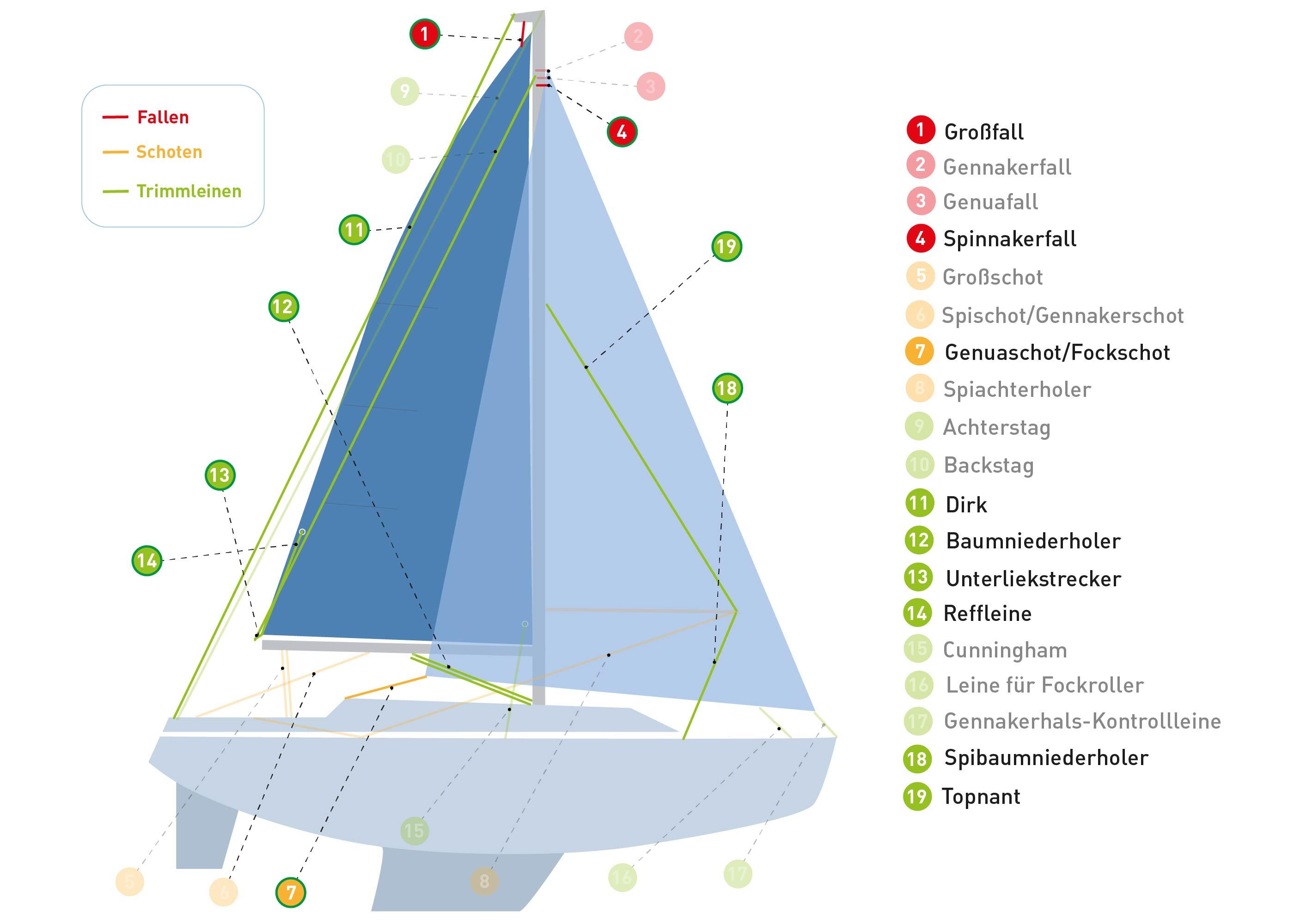 | application | main halyard (1), genoa sheet (7), spinnaker halyard (4), spi foreguy (18), boom vang (12), spipole uphaul (19), topping lift (11), main outhaul (13), reefing lines (14), jib sheet (7) |